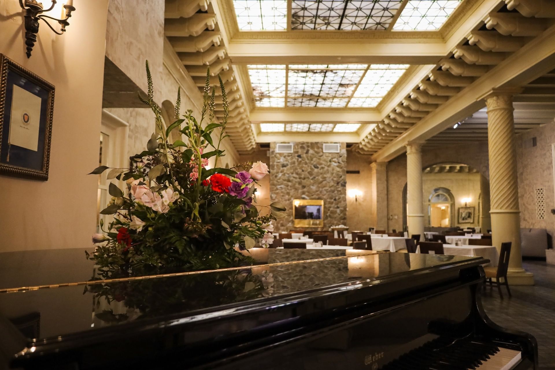 Perfect for smaller weddings and banquets, the Fountain Room features a beautifully preserved tile fountain, a faux fireplace, and grand columns that add to its intimate, romantic ambiance.